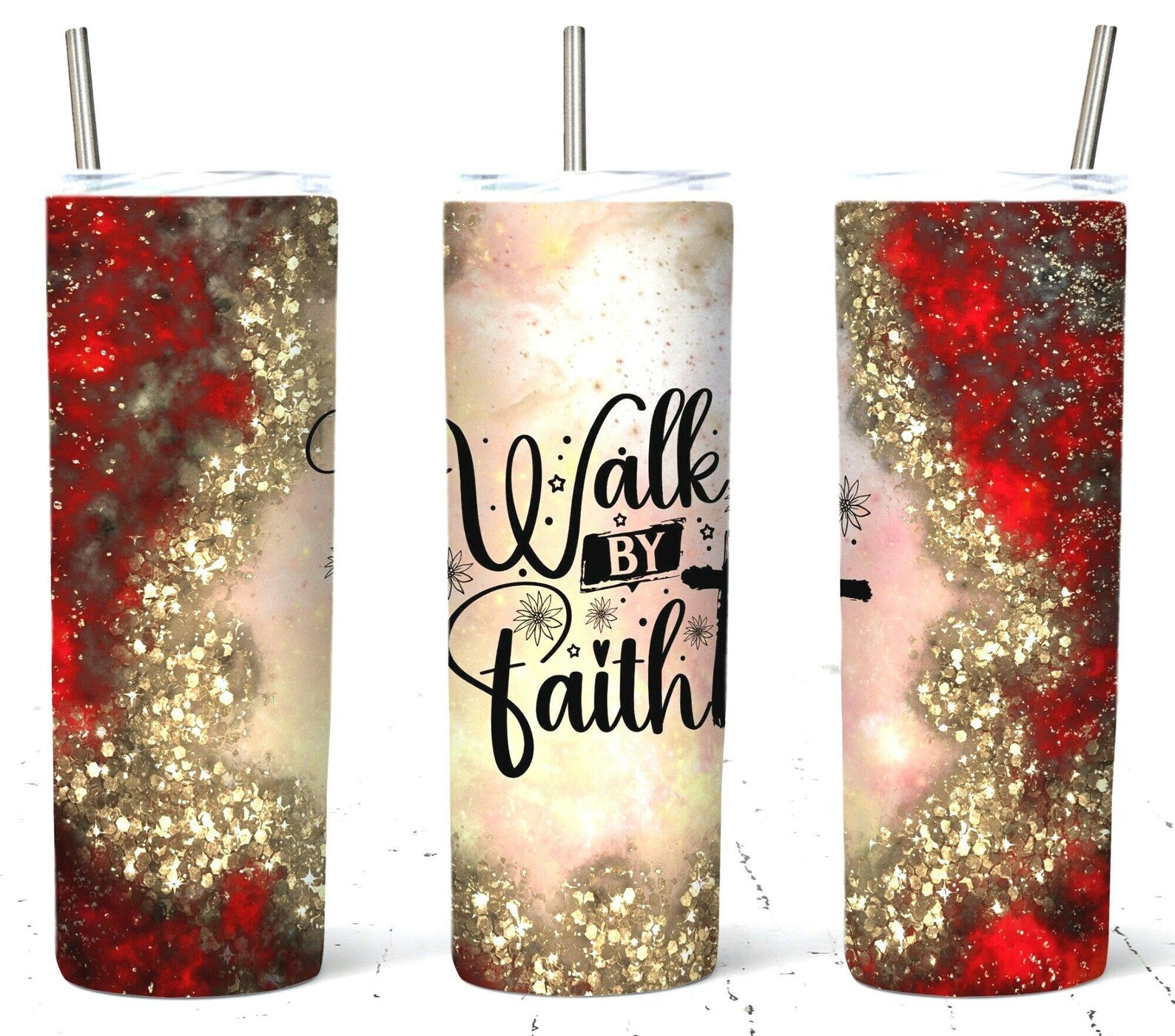 Stay inspired while enjoying your favorite drinks with this 20oz stainless steel tumbler. Featuring a bold “Walk by Faith” design with sparkling gold, red, and white accents, it’s perfect for both hot and cold beverages. Durable, stylish, and uplifting — take your faith wherever you go!